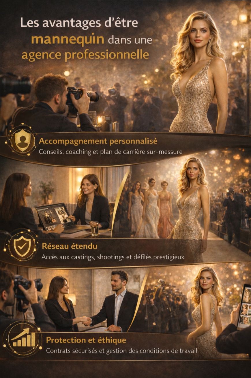 Avec une agence, vous êtes soutenu dans votre carrière grâce aux conseils avisés de professionnels expérimentés. Ils vous aident à tracer votre chemin dans le mannequinat, que vous souhaitiez vous spécialiser en haute couture, en publicité ou explorer les multiples facettes du métier.